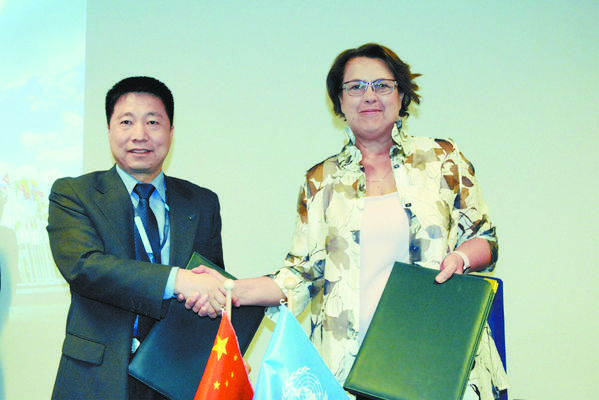 当地时间6月19日,在奥地利维也纳联合国城,中国载人航天工程办公室主任杨利伟(左)和联合国外层空间事务办公室主任西莫内塔·迪皮波签署中国空间站合作补充协议后握手。 今年是联合国探索与和平利用外层空间会议召开50周年。正在维也纳参加相关纪念活动的中国代表团19日举办“中国的航天合作:构建命运共同体和造福全人类”主题宣介会,展示中国在载人航天、深空探测、北斗导航、空间能力建设等主要领域的成就和国际合作情况。 新华社记者 刘向 摄