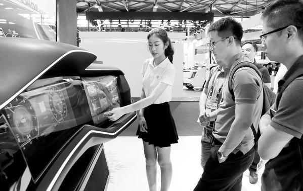 6月27日,工作人员向参观者演示一个使用移动互联网技术的人车交互汽车中控台。