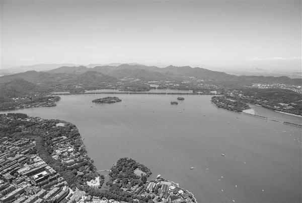 7月15日,杭州西湖景区碧空如洗,湖面上游船如织(无人机拍摄)。