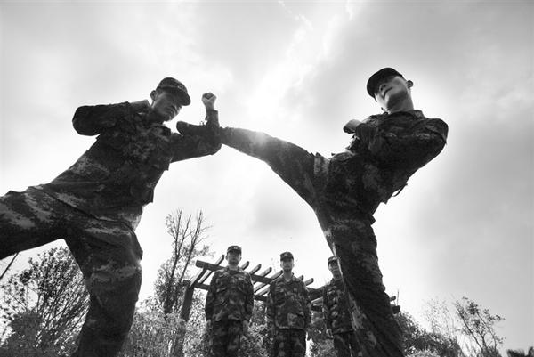 7月31日,武警江苏扬州边防检查站监护一中队的战士进行擒拿格斗训练。