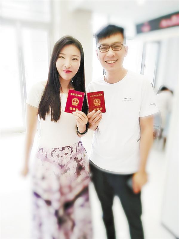市民刘丽(化名)和男友相识多年,他们从朋友发展到恋人,今天一早就来排队领证,拿到红彤彤的结婚证,二人脸上露出幸福的笑容。“‘七夕’是中国的情人节,今天领证很浪漫,以后每年的‘七夕’,都是我们的结婚纪念日。” 刘丽说。