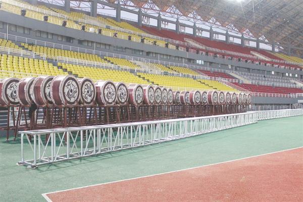 在场地的一侧,几名工作人员正在全神贯注地整理一大堆号码贴,“省运会是全省的体育盛会,能有机会参与这样的运动会是一种荣幸,我们是志愿者,属于义务劳动。”其中一名女士介绍,这是细活,急不得,英文的26个字母分大小写,然后还要和阿拉伯数字进行组合,号码非常多,她们的工作就是要把这些号码捋顺,防止出现差错。场地四周设置了很多音响,工作人员正在调试播音设备,虽然还处于调试阶段,但是听起来已经非常震撼。在场地一角,部分表演道具整齐摆放着,通过这些精致的道具,可想开幕式当天的文艺表演应该非常精彩。