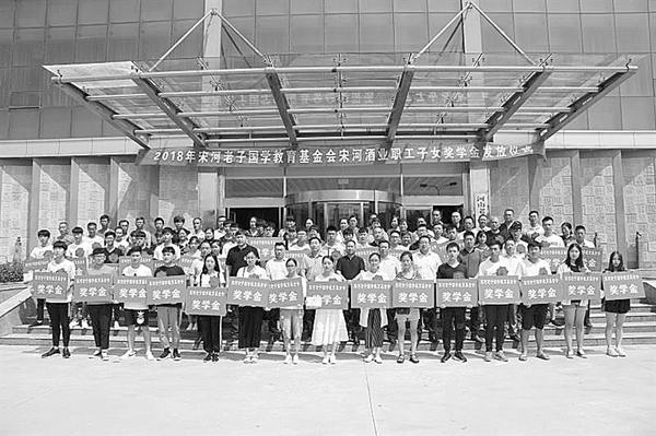 近日,宋河酒业举行了2018年宋河老子国学教育基金会宋河酒业职工子女奖学金发放仪式,为今年考入二本以上的45名宋河职工子女颁发奖学金。该基金会成立8年来,共资助1600多名贫困大学生,援建希望小学3所,发放《新华字典》15万余册、图书近20万册,捐助总额近8000万元,深受全省人民的好评。通讯员 李杰 摄