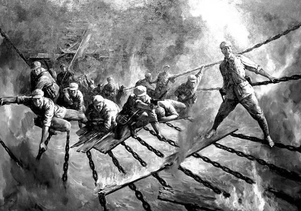 飞夺泸定桥,当时红军情势非常危急,前有守军,后有追兵,必须及时渡过大渡河。敌我双方都隔河朝泸定桥飞奔而去,时任红四团政委的杨成武将军在回忆文章中写道:“敌人大部分沿河东岸北上,跟我们隔河齐头并进。如果我们比敌人早到泸定桥,胜利就有希望,不然,要想通过泸定桥就很困难,甚至不可能了。我们要和敌人抢时间,要和敌人赛跑……我们已清楚地看见对岸的敌人仍然还和我们并肩前进……”对岸敌人点起火连夜赶路,红军战士也点起火,并迷惑对方,让他们以为也是国民党军队,“两岸敌我的火把交相辉映,远远望去,像两条飞舞的火龙,把大渡河的河水映得通红……蠢猪似的敌人万万想不到,大摇大摆地跟他们并排走的,就是他们日夜梦想着要消灭的英雄红军,糊里糊涂地同我们一道走了二三十里。后来,雨下得更大了,到深夜十二点钟,对岸的那条火龙不见了,他们大概是怕苦不走了。这一情况立刻传遍全团,同志们纷纷议论着:抓紧好机会啊!快走,快走啊!一个跟着一个拼命地向前赶路”。