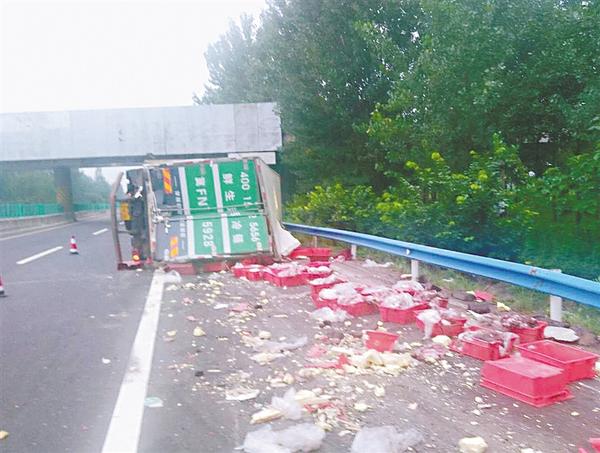 到达现场后,陈安全和同事张刚良、任春胜看到一辆满载冷鲜肉的河北牌照货车被一辆广东牌照的集装箱物流货车追尾,河北牌照的货车侧翻,货物散落一地(如图),司机等两人受伤。