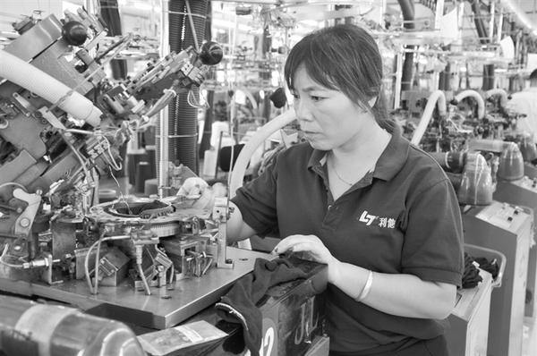 商水县狠抓项目建设不放松,对市、县重点项目实行县四个班子领导联系分包责任制,认真落实联审联批等工作机制,并采取观摩点评、现场办公等方式,解决项目建设中存在的系列问题,有力推进了项目建设顺利进行。图为近日周口市利他针纺织品公司织袜生产车间工人正在检查织袜生产线。 记者 付永奇 摄