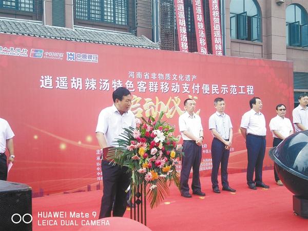 本报讯 9月6日上午,由人行周口市中心支行、西华县人民政府主办,中国银联河南分公司、中原银行周口分行、人行西华县支行承办的“河南省非物质文化遗产逍遥胡辣汤特色客群移动支付便民示范工程启动仪式”在西华县华遥胡辣金汤店前广场举行。人行郑州中心支行、中国银联河南分公司、人行周口市中心支行、中原银行周口分行以及西华县人民政府、周口市餐饮协会有关负责人参加了仪式。