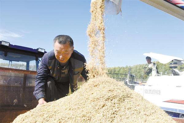 在位于黑龙江省鹤岗市的黑龙江垦区绥滨农场,职工杨宝军在查看水稻饱满度(9月16日摄)。