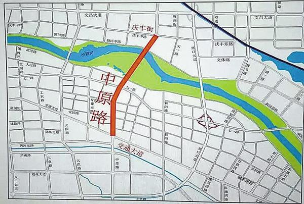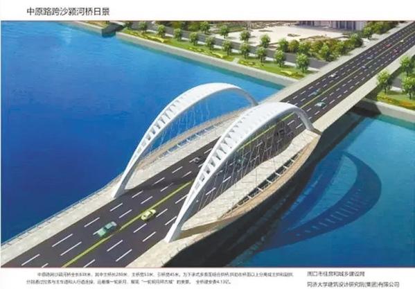 中原路跨沙颍河大桥及道路打通工程,共包含桥梁工程、道路工程和地下综合管廊工程3部分建设内容,项目总投资估算7.9亿元。道路工程南起交通大道,北至庆丰路,全长2555米,红线宽度55米。同步建设的地下综合管廊,南起交通大道,北至七一路,长1167米。中原路跨沙颍河大桥桥长878米,宽45米,建安费投资估算4.14亿元。中原路跨沙颍河大桥桥型方案市委、市政府经过多次研究,于2018年1月18日确定,桥型采用下承式组合拱桥,远看像一轮新月,展现了“一轮明月照古城”的美景,建成后将成为中心城区沙颍河上又一道美丽风景线。