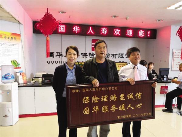 本报讯 日前,国华人寿周口中支客户李先生,将写有“保险理赔显诚信,国华服务暖人心”的牌匾,送到公司工作人员面前(如图),以感谢国华人寿迅速、诚信的理赔服务。