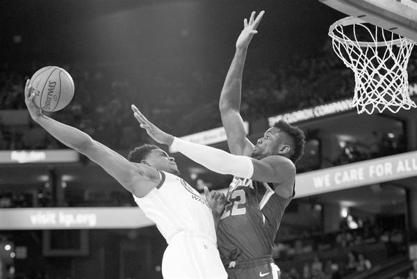 图为当日勇士队球员豪斯(左)的上篮遭到太阳队球员艾顿的封盖。新华社发