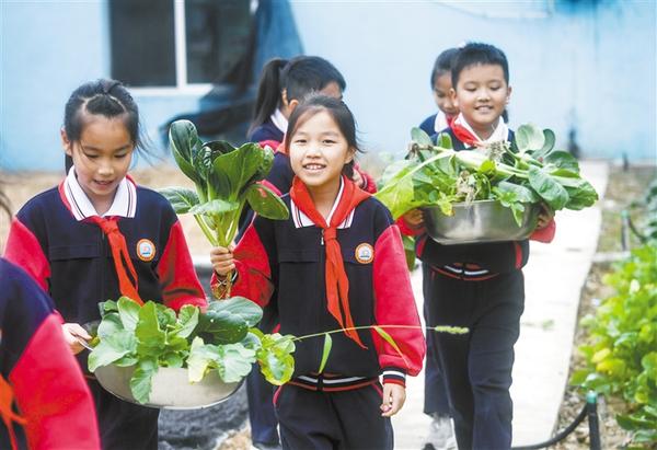 10月10日,学生把采摘好的蔬菜集中运往学校食堂。