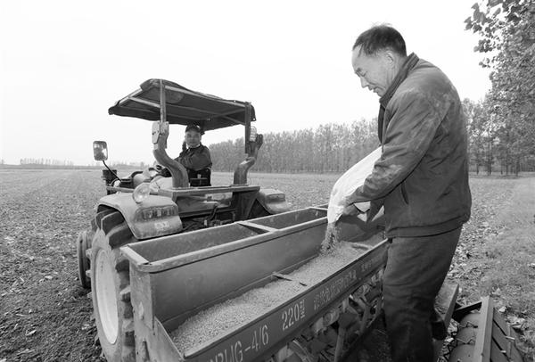 10月14日,山东省临沂市郯城县会义家庭农场场长王会义(右)向农机里倒麦种。