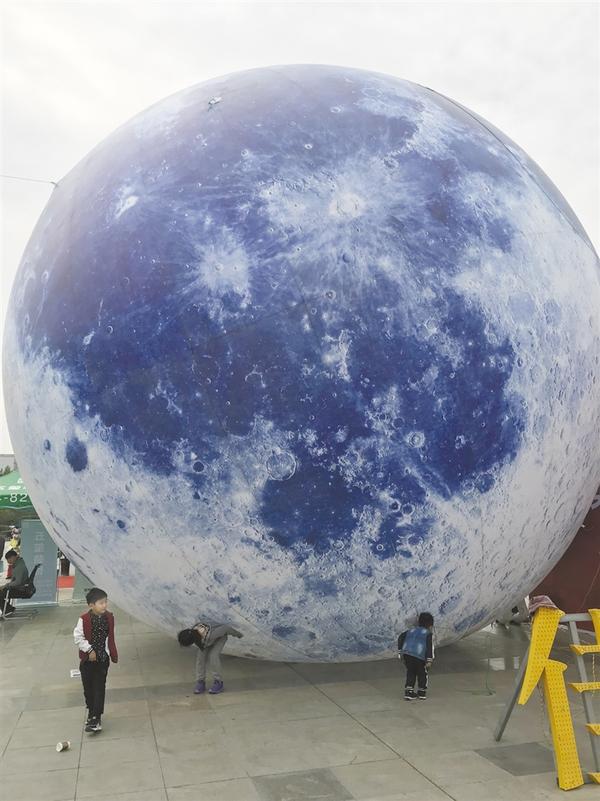 记者在现场看到,这个“大月亮”块头很大,摆放在展厅前。前来参加展会的市民纷纷拍照,有的市民还把它发到微信朋友圈,称“周口有个超级大月球”。