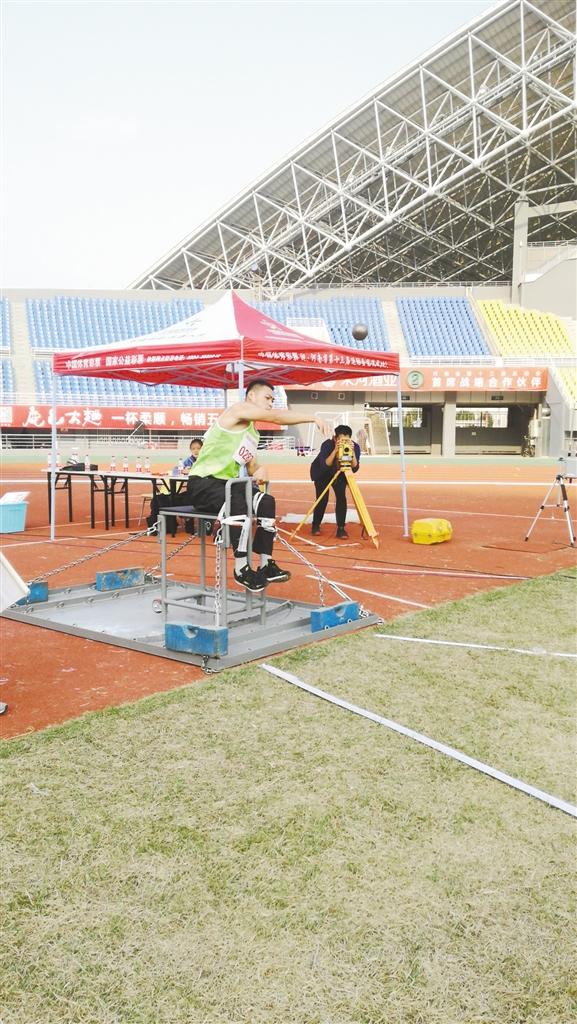 10月22日下午,在河南省第七届残疾人运动会跳高和铅球项目比赛中,参赛选手顽强拼搏,展示了积极向上的精神面貌。图为铅球比赛现场。记者 牛思光 摄