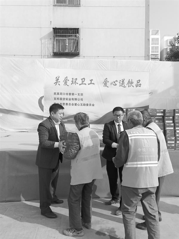 本报讯 为表达对环卫工人的敬意,10月22日上午,民革周口市委第一支部联合爱心企业在八一大道与文昌大道交叉口东北角,为中心城区近400名环卫工人发放饮品。