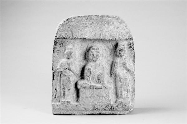 该造像碑高34厘米,宽28厘米,保存完整。碑阴造像三尊,为一佛二菩萨。本尊释迦牟尼,肉髻圆形光头,身穿敞肩大衣,衣纹为羊肠状,坐于长方形须弥座上,两侧的二菩萨,衣着相同,均头带宝冠,披帛下飘且交于腹部,下穿裙,赤足立于方座上。碑阴刻铭文,魏碑书体,竖行排列,共6行,计58字:大魏武定七年,岁次主已二月丁亥,朔十五日来丑比丘,普朗造像一躯为国□□□王常主□师僧父母□□□中,法界口众生,□□□□一时成佛。