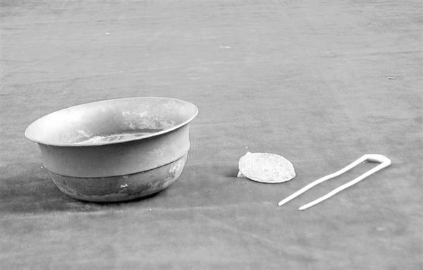 银碗,口径8.9厘米,高3.7厘米,重65克。侈口,平底,腹中部饰一周凸旋纹。
