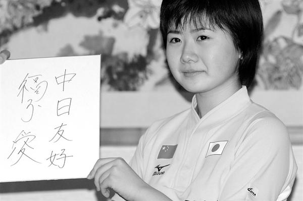 图为2005年4月23日,福原爱在中国驻日本大使馆向记者展示她书写的“中日友好”四个字。 新华社记者 孙巍 摄