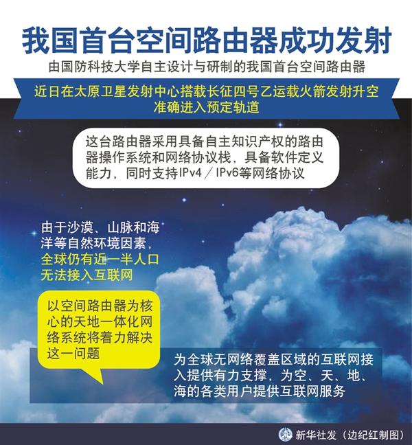 这次发射任务的圆满成功,标志着我国首台空间路由器正式进入在轨验证试验阶段。这台路由器采用具备自主知识产权的路由器操作系统和网络协议栈,具备软件定义能力,同时支持IPv4/IPv6等网络协议。