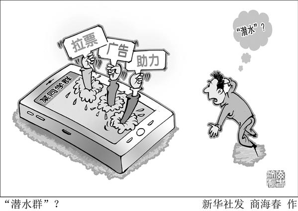初中同学群、高中同学群、大学同学群……记者近期调查发现,通过社交媒体,不少人加入了各类同学群,有的甚至连幼儿园、小学同学都建了群。但不少群建群时热热闹闹,不久就冷冷清清,少数几个人唱“独角戏”,大多数人都成了“潜水员”;有的群还逐渐异化成为“拉票群”“广告群”“助力群”,虽然反感,但是碍于情面,也不好意思贸然退出。新华社发 商海春 作