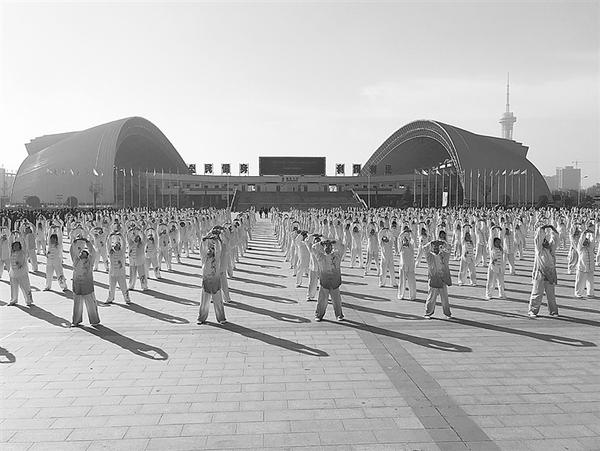 3日9时许,在市体育中心广场,千余名身穿各式练功服的中老年人随着悠扬的古典音乐,表演八段锦和导引养生功等健身气功。表演者整齐站立,呼吸吐纳不疾不徐,动作舒缓又行云流水。