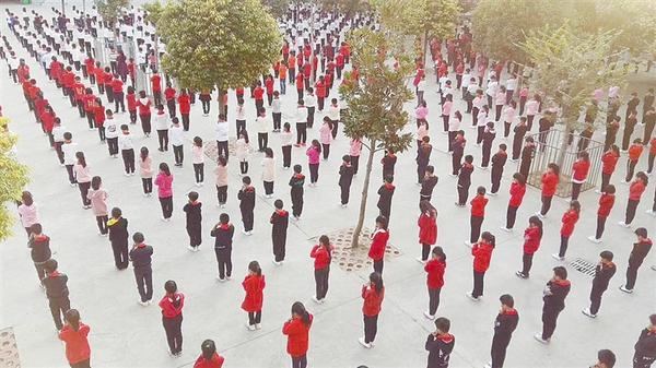 本报讯 11月1日,周口六一路小学校举行了课间操比赛(如图)。比赛中各班学生穿着统一服装,个个精神抖擞,昂首挺胸,列队入场。伴着音乐,同学们步伐整齐、动作有力,举手、抬脚、弯腰、转身、跳跃都是那么整齐一致,动作中充满着坚定与自信。