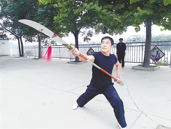 金现中,65岁,淮阳县人。金现中从小就开始练习查拳,2009年参加焦作全省武术比赛,获得大刀一等奖;2011年参加长春举办的全国武术比赛,获得套路比赛二等奖。2014年退休后,他仍然坚持练习查拳。图为金现中在练习查拳大刀。通讯员 张然 摄