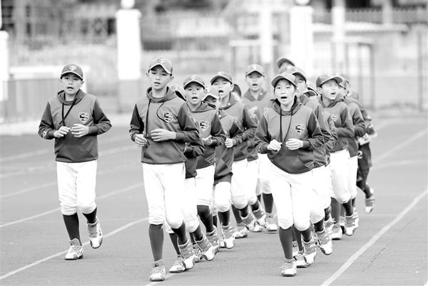 图1.11月8日,在连城县实验小学运动场,小棒球手在训练前热身。