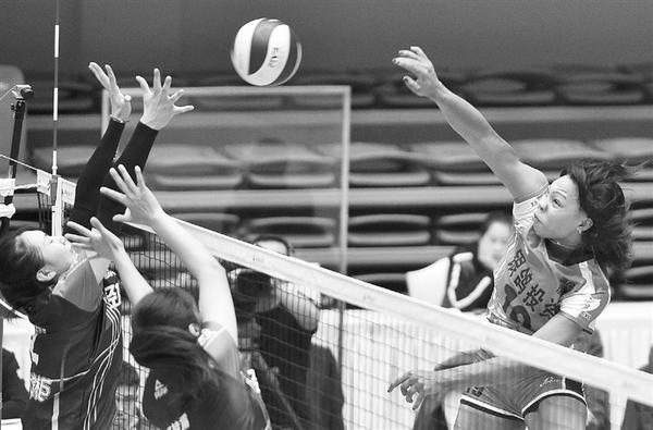 图为当日河南银鸽投资队球员贝尔(右)在比赛中扣球。
