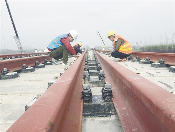 本报讯 11月20日上午,记者在郑合高铁周口段西华站施工现场看到,几名技术人员正在对道岔进行检查(如图)。据了解,周口东站、西华站无砟道岔已于日前顺利完工,为后续铺轨施工打下坚实基础。