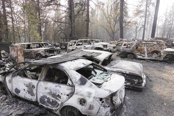 这是当地时间11月19日在美国加利福尼亚州比尤特县天堂镇拍摄的车辆残骸和房屋废墟。