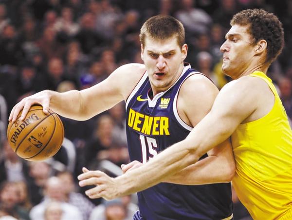 图为当日掘金队球员约基奇(左)在比赛中带球突破。