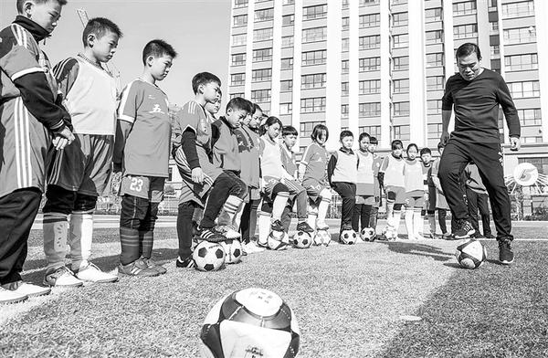 11月22日,河北省枣强县第五小学的足球教练为学生做示范。