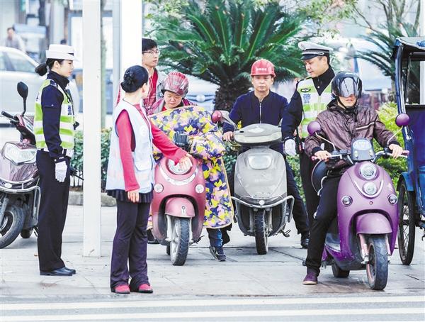12月4日,交警和交通志愿者们在路口进行督导。 从2018年开始,浙江省温州市平阳县公安局交警大队开展“创文明交通、治秩序乱象”专项行动,成立包括社工、义工、学生家长等数百人在内的文明交通志愿队伍。志愿者们配合交警在主要街道路口开展常态化的文明交通劝导行动,并对频繁出现的二轮电动车驾驶人违法行为进行积极劝导,机动车和非机动车的守法率得到明显提升,路口交通事故率明显下降,对文明交通的创建起到了积极的推动作用。新华社记者 徐昱 摄
