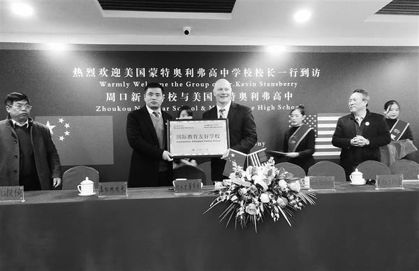 昨日,美国蒙特奥利弗高中凯文·斯坦斯伯里校长等一行代表团莅临周口新星学校访问,并与该校举行友好学校签约仪式。刘永文董事长、王松林校长等校领导热情接待了他们,并举行了简短的欢迎仪式。凯文·斯坦斯伯里校长一行先后参观了校园环境、教学情况等,并走进课堂体验教学活动。活动中,双方校长交流了学校概况、教育理念及办学情况。周口新星学校此次开展国际交流与合作,旨在架起双方学校的友谊之桥,建立中西交流的通道,促进学校国际化办学。记者 陈军强 摄