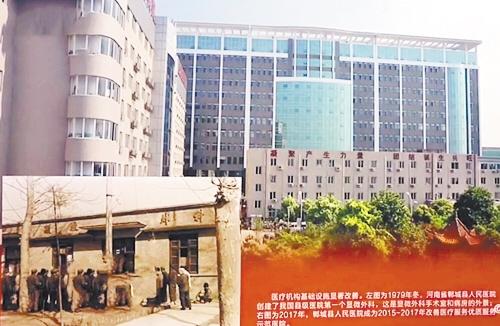 河南广播电视台记者陈贞君在展板前介绍:这里是位于第四展区的两张同一所医院的照片——河南省郸城县人民医院。这张(图一)是1979年冬,郸城县人民医院创建的我国县级医院第一个显微外科手术室和病房外景。另一张(图二)是2017年的郸城县人民医院。改革开放让同一所医院有了沧海桑田般的变迁。