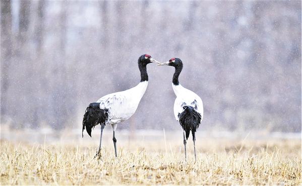 拉萨市林周县是著名的黑颈鹤越冬地,每年10月中旬开始,有大批黑颈鹤迁徙到此。据介绍,在林周县越冬的黑颈鹤数量稳定在1700只左右,最高可达2000只左右。12月18日至19日,西藏大部分地区普遍降雪,雪中的黑颈鹤显得格外美丽。新华社发
