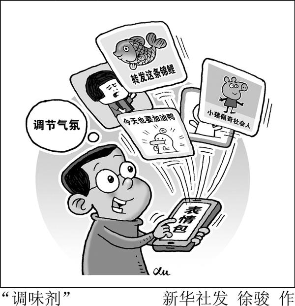 “转发这条锦鲤”“小猪佩奇社会人”“今天也要加油鸭!”记者近期调查发现,包括网红明星、萌宠、二次元动漫等在内的多种表情包,已经成为人们在网络上表达情绪的主要载体。然而,不分场合地随意刷屏、斗图,让原本真诚的交流变了味,过量使用表情包需要防止“消化不良”。新华社发 徐骏 作
