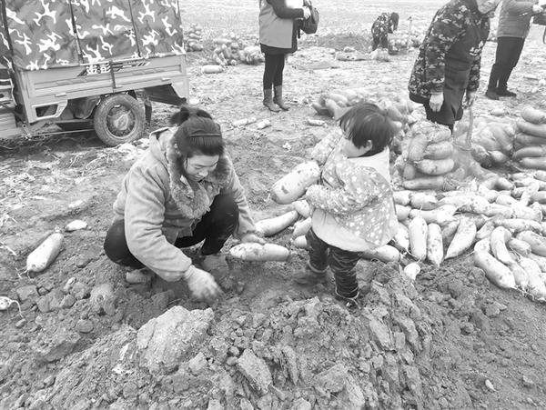 走在淮阳县刘振屯乡张老家村的田间地头,记者看见刘玉梅正将萝卜从地里扒出来装车,她的小侄女也帮起忙来,吃力地抱起了一个大萝卜。 记者 王凯 摄
