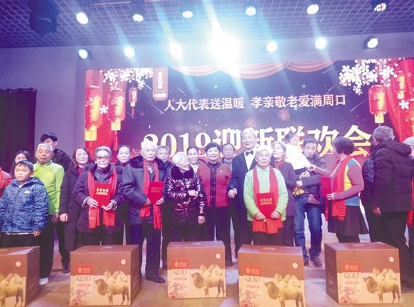 本报讯 1月25日下午,周口饭店多功能厅里欢歌阵阵,一派欢乐祥和的景象。上百位老人在家人的陪伴下,欢聚在这里共同观看“人大代表送温暖 孝亲敬老爱满周口”2019迎新联欢会。活动现场,朱炳修等8个家庭被评为“年终最美家庭”,并登台接受表彰(上图)。