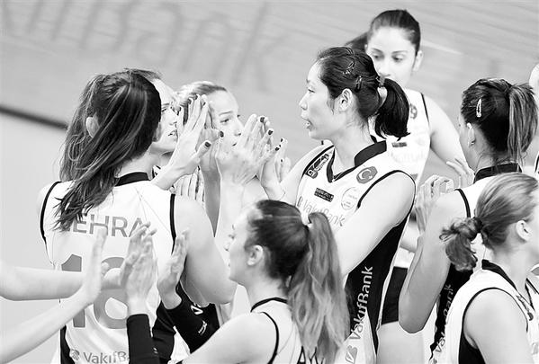 图为当日瓦基弗银行队球员朱婷(中)在比赛中与队友交流。