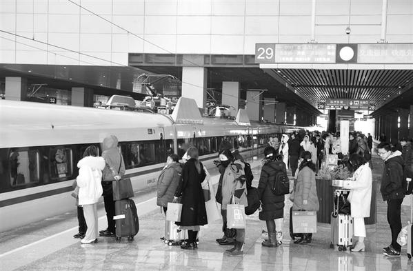 2月10日,旅客在郑州东站站台等待乘车。 当日是农历正月初六,多地迎来返程客流高峰。新华社记者 冯大鹏 摄
