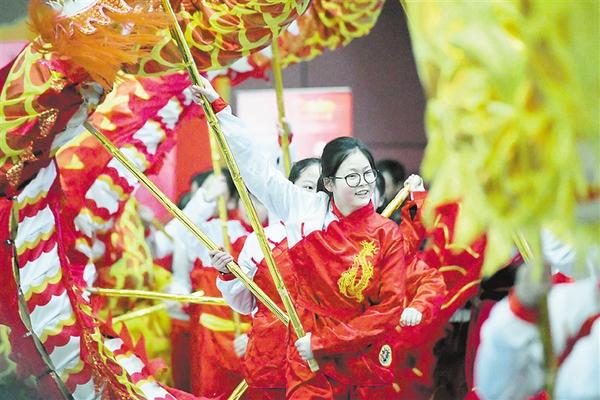 2月17日,中学生在2019首届湖南非遗元宵喜乐会上表演舞龙舞狮。元宵佳节临近,各地举行丰富多彩的民俗展演活动,热热闹闹迎元宵。新华社发