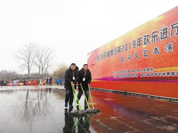 2月18日上午,降雪天气给正在周口公园举行的周口市2019年“欢乐进万家”春节文化活动之一民间文艺表演活动造成一定影响。活动开始前,市文联工作人员抓紧时间清理舞台,保障演出正常进行。记者 窦娜 摄