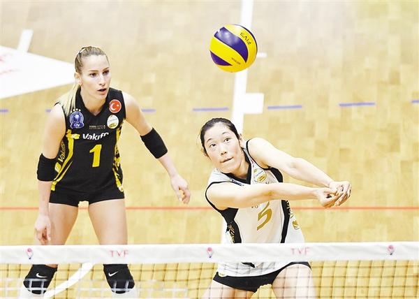 当地时间2月17日,瓦基弗银行队球员朱婷(右)在比赛中接球。