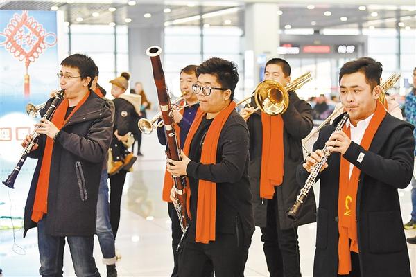 2月19日,太原火车南站的工作人员在为旅客演奏乐曲《我和我的祖国》。