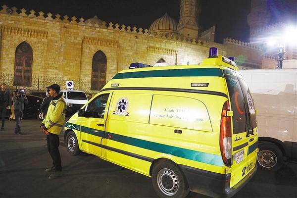 2月19日,在埃及首都开罗,一辆救护车停在爆炸现场附近。