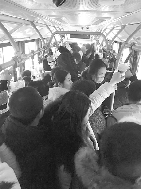 2月20日,在一辆16路公交车里,乘客摩肩接踵。为此,司机只能让乘客从后门上车,个别乘客放弃乘车。