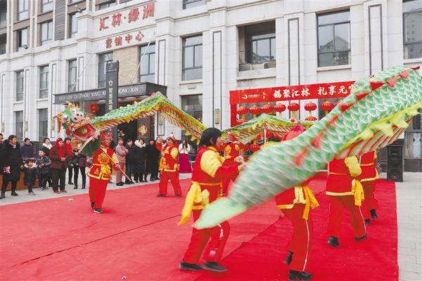 火红的大鼓被民间艺人擂得声震云天。紧接着,舞龙队员精神抖擞,舞动着9 米长的“巨龙”,只见“巨龙”迎风飞舞、盘旋,一众舞龙好手技巧纯熟,摆出8字花式、游龙穿腾、翻滚缠绞等高难度动作,赢得观众的阵阵掌声。舞狮、划旱船、抬花轿、扭秧歌等节目依次上演,为业主献上了一份喜庆的元宵节文艺大餐。一位带着孩子参与活动的业主表示,元宵节的丰富活动不但让孩子们感受到了春节传统文化的喜庆氛围,也让孩子们锻炼了大脑反应能力,并传承和发扬了春节文化,活动非常有意义。